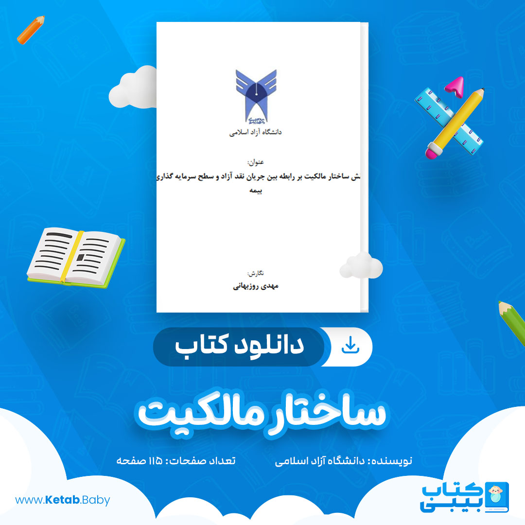 کتاب ساختار مالکیت دانشگاه آزاد اسلامی، به بررسی مفاهیم و نظریه‌ های مرتبط با مالکیت و تأثیر آن بر جنبه‌ های مختلف اقتصادی و اجتماعی می‌ پردازد. این کتاب معمولاً برای دانشجویان و پژوهشگران در زمینه‌ های اقتصاد، مدیریت و حقوق طراحی شده است.